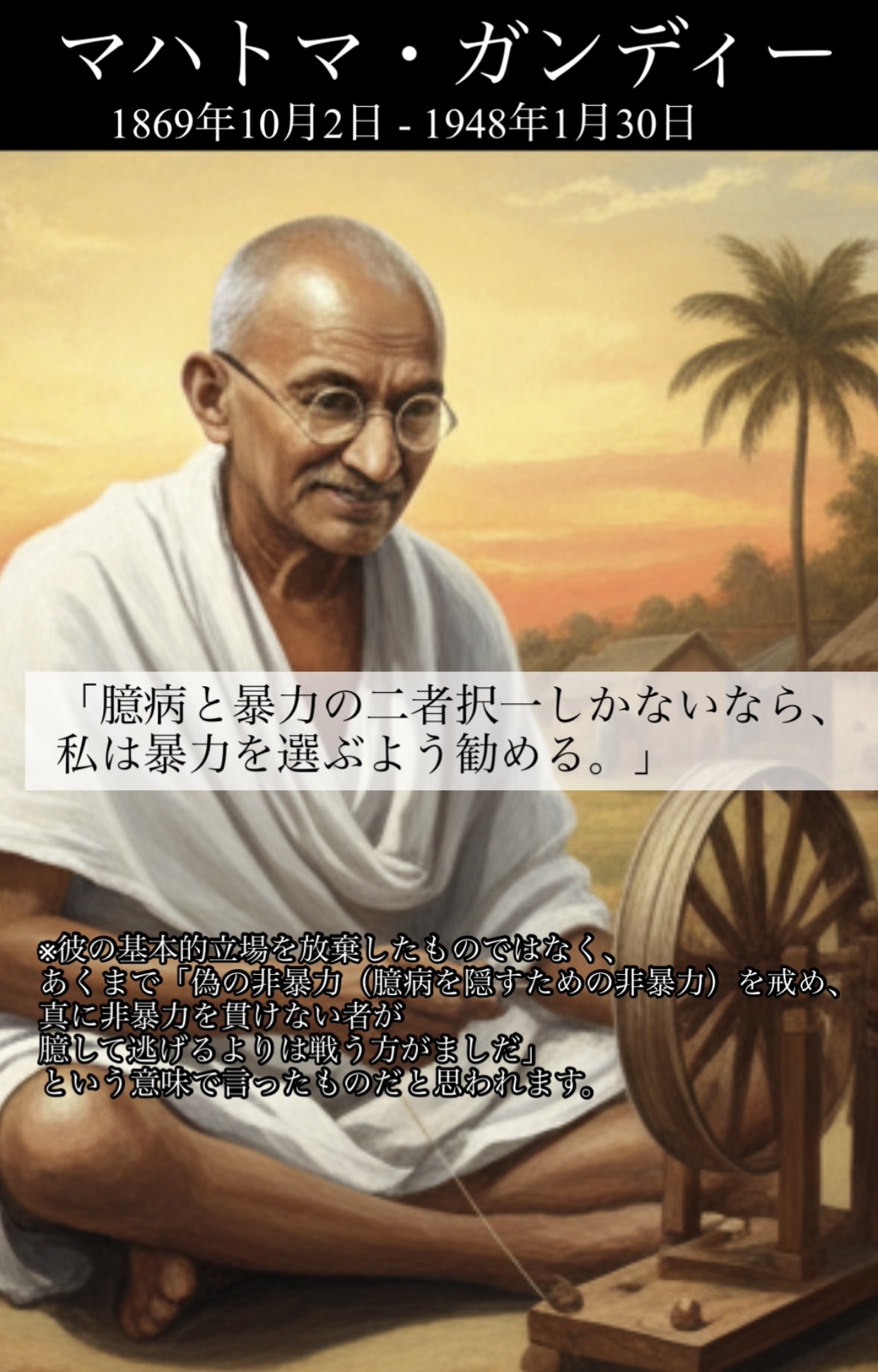 ※彼の基本的立場を放棄したものではなく、あくまで「偽の非暴力(臆病を隠すための非暴力)を戒め、真に非暴力を貫けない者が臆して逃げるよりは戦う方がましだ」という意味で言ったものだと思われます。