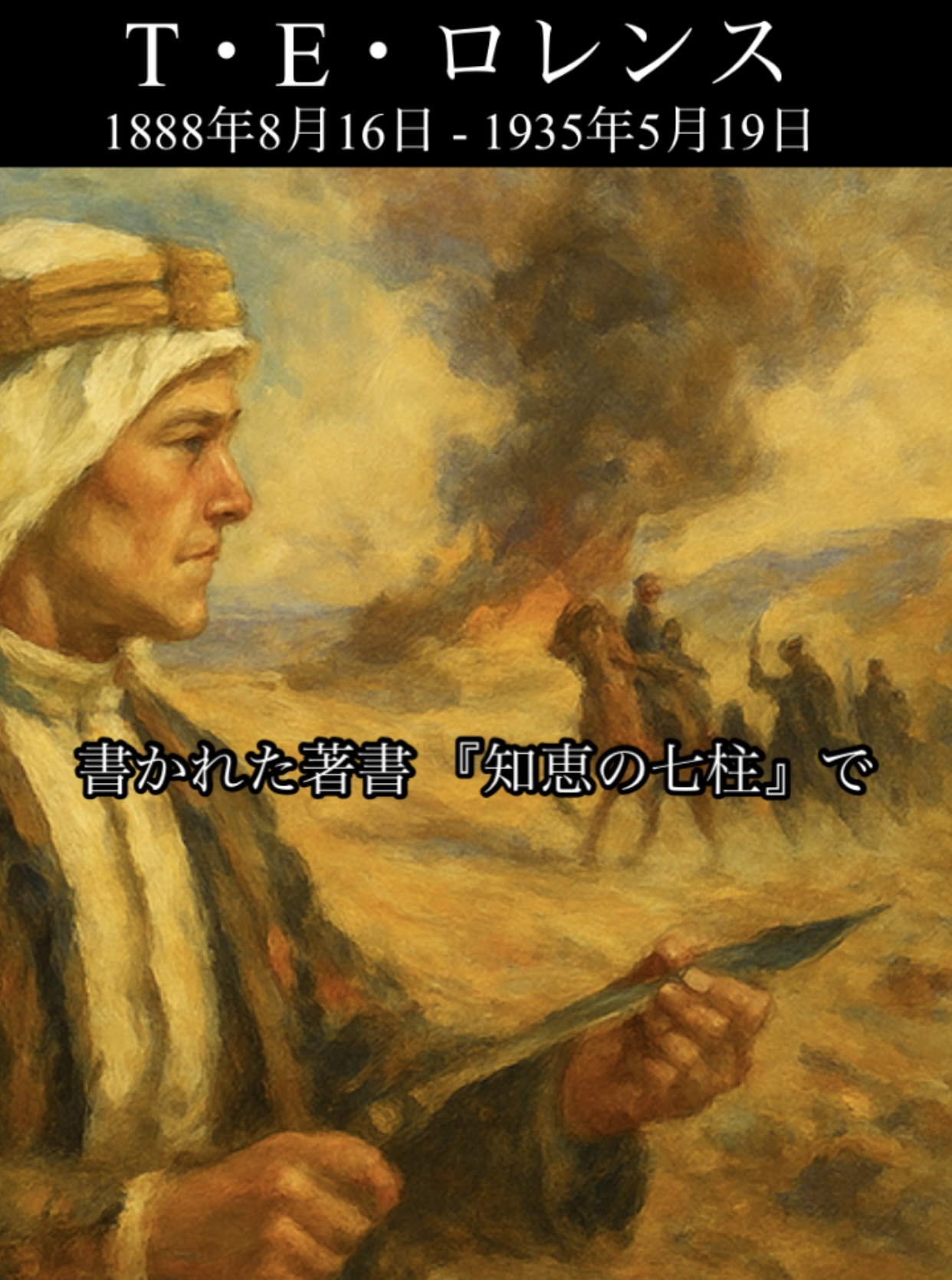 中東での活動を通じて現地の人々と強い信頼関係を築き、戦後はその経験をもとに書かれた著書『知恵の七柱』で高く評価されました。詩的かつ哲学的な言葉を多く残し、今なおカリスマ的な伝説的人物として語り継がれています。
